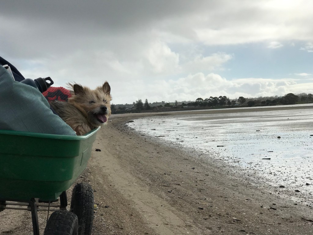 In this moment our kurī Poki was injured so I put her in this pull cart and off we went to the beach. She was soooo happy that she could come with the whānau and wasn’t left out. This moment was perfect in every way. She was in pain but right here she was content – all that I could ever aim for. Our moments – the very one now that has brought you to this page, to read this text was meant to be. And this moment is all that we have. The present. Be still and the present will stay.